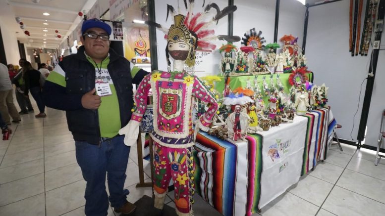 Gilberto Vázquez Vázquez, artesano de figuras de hojas de maíz, originario de la comunidad de San Estaban Tizatlán, ofrece a los visitantes a la Feria figuras de huehues, nacimientos y catrinas, entre otras piezas elaboradas a base de productos del maíz.