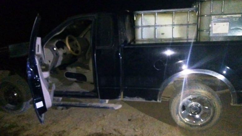 Asimismo, al implementar recorridos pie tierra en zonas aledañas, a unos 300 metros de La Laguna Azul, se ubicó una camioneta marca Chevrolet, tipo C-35, con placas de circulación del Estado de México y cargada con cuatro bidones vacíos, al consultar su estatus, arrojó una alerta de robo mediante el número de emergencias 911, con fecha de junio de 2017.