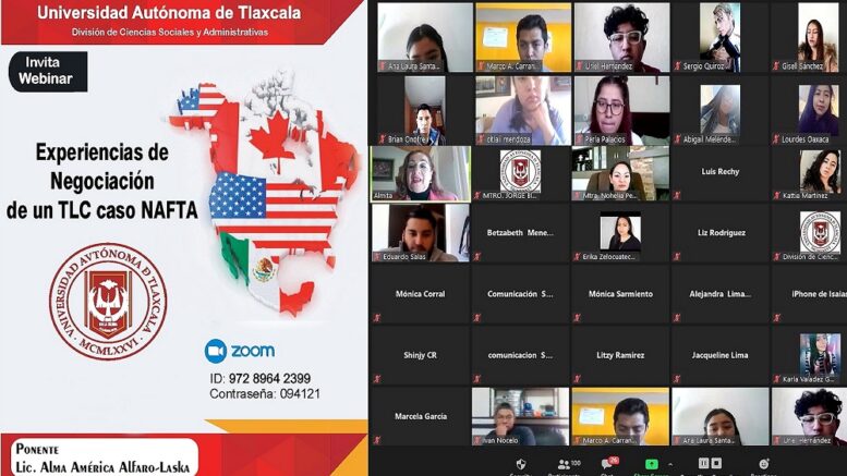 Coyuntura/Con el objetivo de conjuntar los conocimientos adquiridos y la experticia que vierten las voces que marcan la construcción de nuevos aprendizajes, la División de Ciencias Sociales y Administrativas de la Universidad Autónoma de Tlaxcala (UATx), llevó a cabo los webinars “Cultura de los negocios en Estados Unidos” y “Experiencias de negociación de un TLC, caso NAFTA”, impartidos por la Lic. Alma América Alfaro-Laska, dirigidos a los estudiantes de la Licenciatura en Negocios Internacionales de la Facultad de Ciencias Económico Administrativas.
