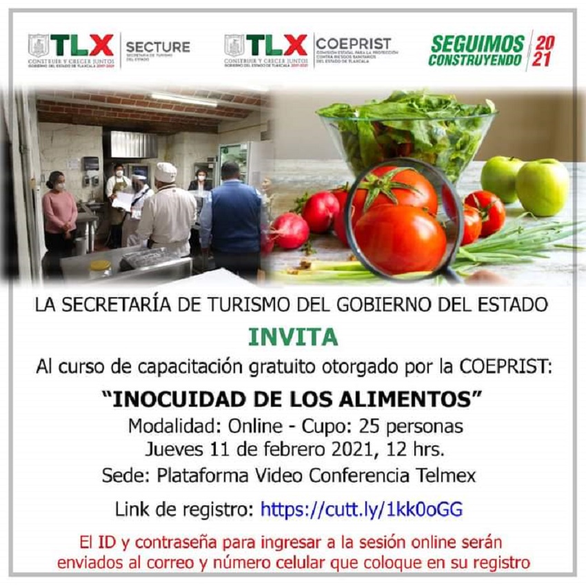 Coyuntura/La Comisión Estatal para la Protección contra Riesgos Sanitarios de Tlaxcala (Coeprist) y la Secretaría de Turismo del Estado (Secture) invitan a prestadores de servicios y dueños de establecimientos del sector a la capacitación en línea gratuita sobre «Inocuidad en los Alimentos».