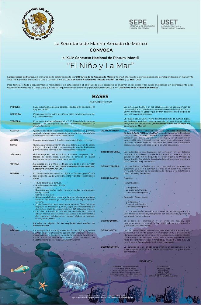 Coyuntura/La Secretaría de Educación Pública del Estado (SEPE) y la Unidad de Servicios Educativos de Tlaxcala (USET) invitan a niñas y niños de entre 6 y 12 años de edad a participar en el “XLIV Concurso Nacional de Pintura Infantil el Niño y la Mar».