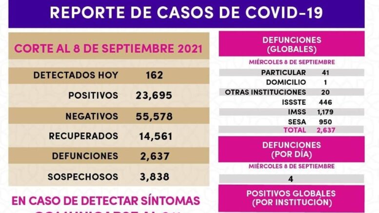 La SESA confirmó 162 casos positivos y cuatro defunciones el 8 de septiembre de 2021.
