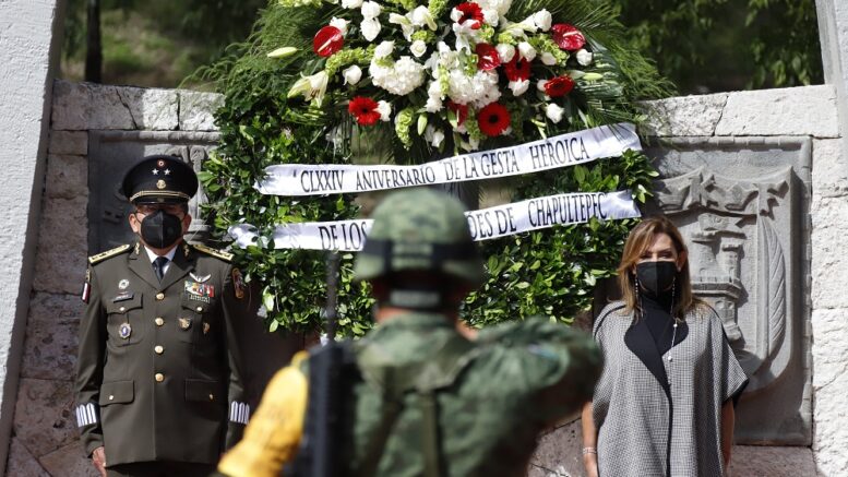 - La titular del Ejecutivo, autoridades civiles y militares depositaron ofrenda floral en el monumento a los cadetes.