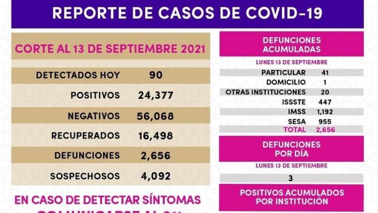 La SESA confirmó 90 casos positivos y tres defunciones el 13 de septiembre de 2021.
