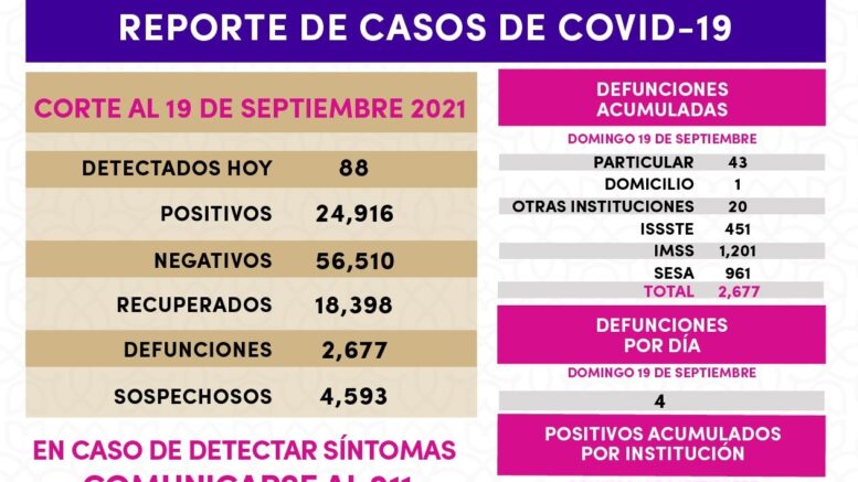 Los datos de la SESA registrados en la plataforma nacional del Sistema de Vigilancia Epidemiológica de Enfermedades Respiratorias (SISVER), confirmaron 88 casos positivos y cuatro defunciones el domingo 19 de septiembre de 2021.