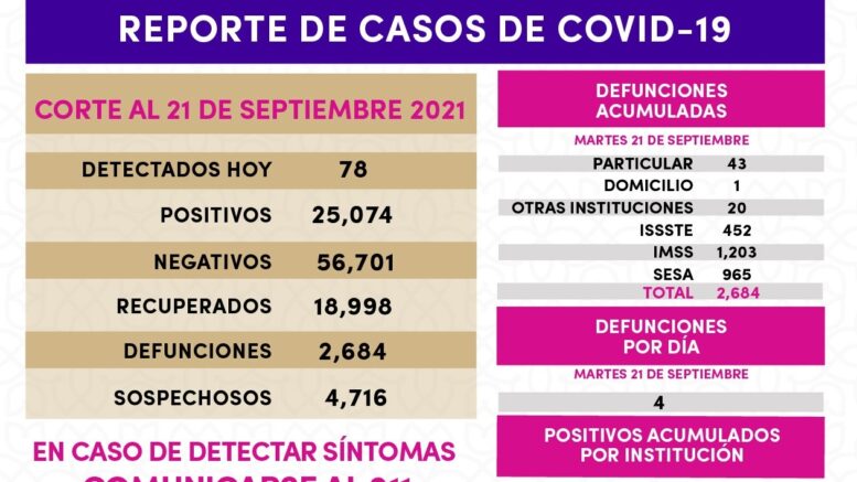 De acuerdo con los datos de la SESA registrados en la plataforma nacional del Sistema de Vigilancia Epidemiológica de Enfermedades Respiratorias (SISVER), confirmó 78 casos positivos de Covid-19 y cuatro defunciones el martes 21 de septiembre de 2021.