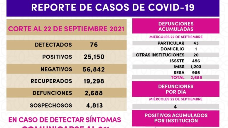 La SESA, a través de los datos registrados en la plataforma nacional del Sistema de Vigilancia Epidemiológica de Enfermedades Respiratorias (Sisver), confirmó 76 casos positivos de Covid-19 y cuatro defunciones el miércoles 22 de septiembre de 2021.