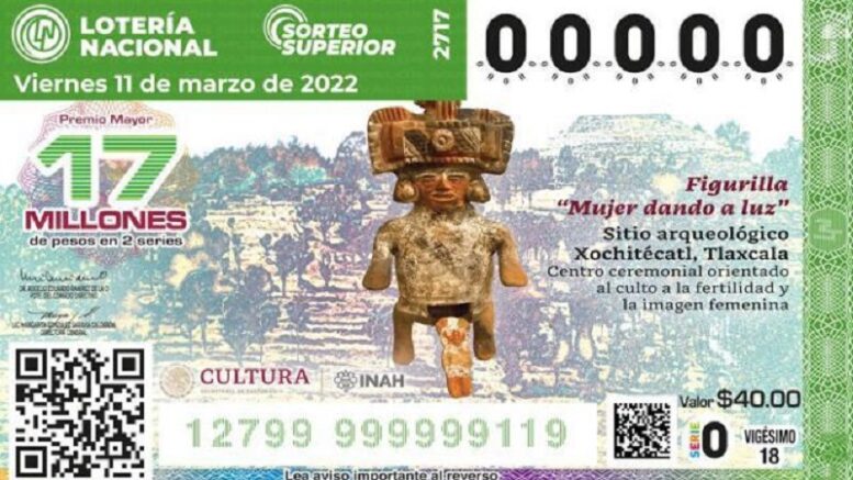 Una figurilla prehispánica de una mujer dando a luz y de fondo la Zona Arqueológica de Xochitécatl, es la imagen plasmada en los 2 millones 400 mil cachitos que se encuentran a la venta en más de 12 mil puntos en toda la República Mexicana y a través de las plataformas oficiales.