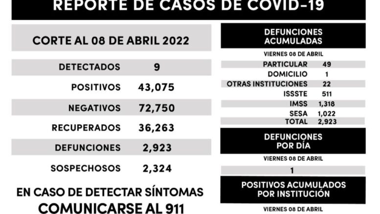Los datos de la SESA registrados en la plataforma nacional del Sistema de Vigilancia Epidemiológica de Enfermedades Respiratorias (Sisver), confirmaron nueve casos positivos de Covid-19 y una defunción, el 8 de abril de 2022 en la entidad.
