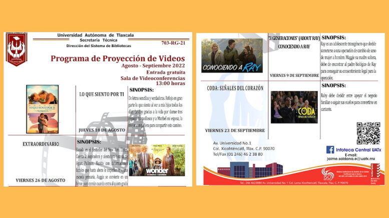 Para este jueves 18 de agosto, se proyectará el video titulado “Lo que siento por ti”, el viernes 26 del mismo mes se tiene programada la cinta “Wonder”, película estadounidense de 2017, el viernes 9 de septiembre se exhibirá el filme “Conociendo a Ray” y el viernes 23 del mes patrio, se presentará la producción “CODA: Señales del corazón”.