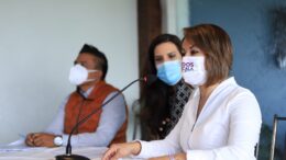 Coyuntura/La coordinadora de campaña de la coalición Unidos por Tlaxcala, Minerva Hernández, acompañada por la senadora Kenia López Rabadán, y Roberto Nava Flores, representante del…